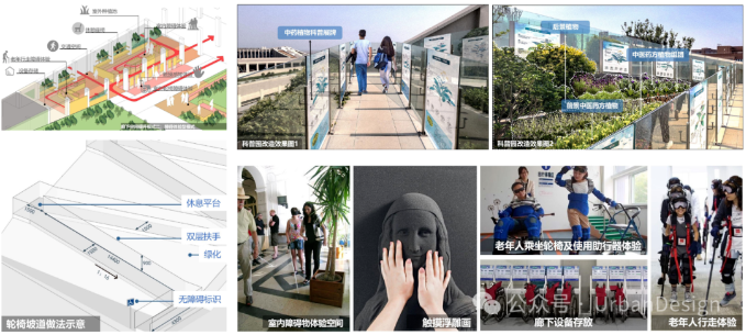 康復(fù)大學(xué)校園無(wú)障礙建設(shè)中,結(jié)合景觀環(huán)境,利用坡道柱廊下空間凈高 3.5~8.5m 區(qū)域及相鄰室外空間設(shè)置障礙體驗(yàn)區(qū),提供臺(tái)階障礙體驗(yàn)、視覺(jué)障礙體驗(yàn)與老年人障礙體驗(yàn)等,活化功能空間并突出康復(fù)教學(xué)特色,成為頗具特色的戶外教學(xué)場(chǎng)所(圖 19)。