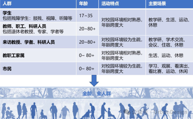 包容性校園的服務(wù)對(duì)象不再是少數(shù)殘障或運(yùn)動(dòng)損傷學(xué)生,而是擴(kuò)展到全體在校師生及工作人員,以及來(lái)往于校園的專家學(xué)者、研究人員及普通市民,即面向全體社會(huì)成員,年齡覆蓋全齡(圖 1)。因此,校園環(huán)境在解決殘障群體需求的基礎(chǔ)上,在空間規(guī)劃和設(shè)施供給中,需要考慮校園內(nèi)各類人群學(xué)習(xí)、工作、生活需求及不同的體能特征和認(rèn)知能力,提供多種可供選擇的通行、使用、交互和服務(wù)的方式。