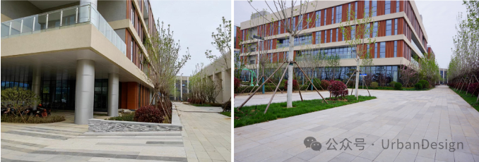 建筑無(wú)障礙出入口是校園無(wú)障礙路徑和建筑樓棟的重要銜接點(diǎn) [4]。建筑組團(tuán)之間通過(guò)無(wú)障礙緩坡地形連接(圖 10),保證通行順暢。