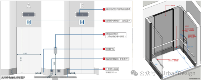 “創(chuàng)新核“建筑群內(nèi)部客梯共計(jì) 8 組 11 部 ,提高標(biāo)準(zhǔn)全部設(shè)置為無(wú)障礙電梯(圖 12),方便所有人使用,避免區(qū)別對(duì)待。電梯口采用八字口,轉(zhuǎn)角進(jìn)行圓角設(shè)計(jì),避免磕碰危險(xiǎn)。候梯廳設(shè)置低位呼梯按鈕、提示盲道、運(yùn)行顯示裝置等,并增設(shè)腳踏按鈕。轎廂內(nèi)設(shè)置低位操作盤、盲文按鍵、三面扶手、鏡面材質(zhì)、報(bào)層音響、聲光顯示裝置等。