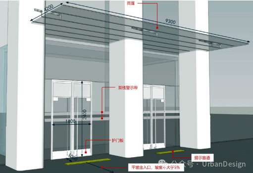 “創(chuàng)新核”主要出入口均為無(wú)障礙出入口(圖 11),并結(jié)合場(chǎng)地環(huán)境,采用坡度小于 5%的平坡出入口,形成便捷通暢的室內(nèi)外無(wú)障礙連通。出入口上方設(shè)置雨棚,外開(kāi)門滿足單扇開(kāi)啟時(shí)輪椅通行寬度要求,玻璃設(shè)置雙線提示帶,門斗滿足門扇開(kāi)啟后的輪椅空間。