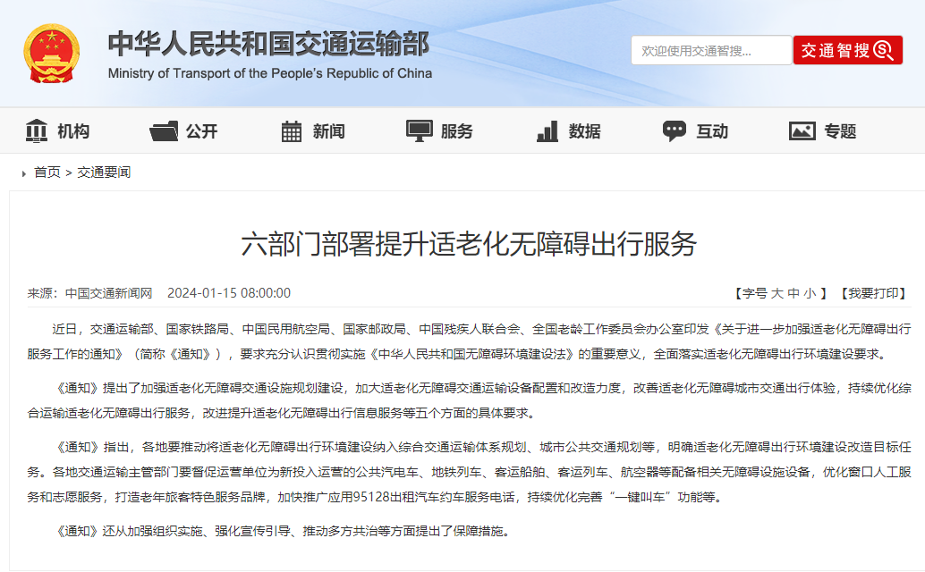 日前,交通運輸部會同國家鐵路局、中國民用航空局、國家郵政局、中國殘疾人聯(lián)合會、全國老齡工作委員會辦公室等6部門和單位印發(fā)了《關(guān)于進一步加強適老化無障礙出行服務(wù)工作的通知》(以下簡稱《通知》),就進一步加強適老化無障礙出行服務(wù)進行工作部署。
