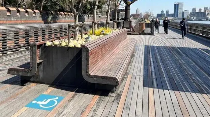 “無障礙”并非只讓殘障人士和老年人受益。攜帶大件行李、使用嬰兒車、短期受傷的市民,同樣是無障礙設施的高頻使用者。比如,楊浦濱江的坡道建設,不僅可以讓乘輪椅的市民方便地到達親水平臺,同樣也給推嬰兒車的家長帶來便捷。