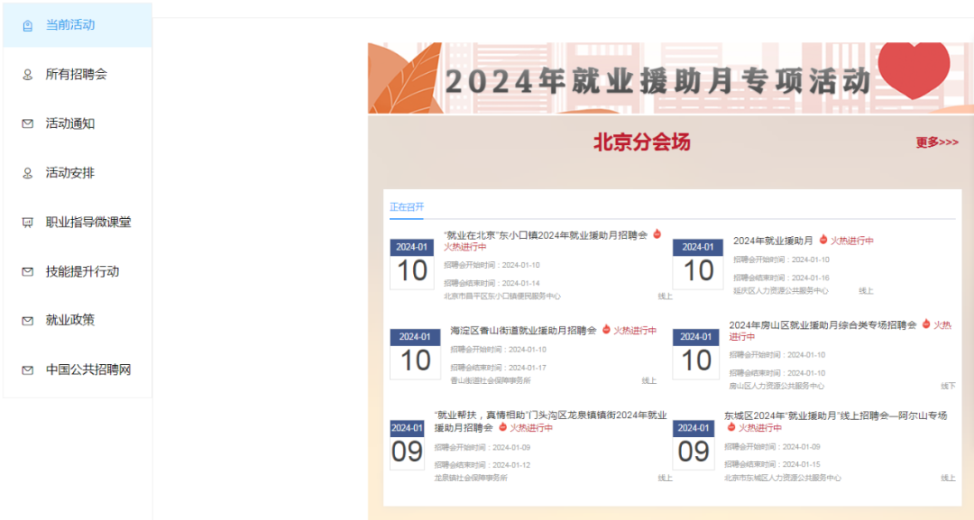 在北京市展開(kāi)的就業(yè)援助月專(zhuān)項(xiàng)活動(dòng)聚焦于零就業(yè)家庭成員、殘疾登記失業(yè)人員(特別是困難重度殘疾人)等就業(yè)困難人員,在北京市、區(qū)兩級(jí)線上服務(wù)平臺(tái)設(shè)置困難就業(yè)專(zhuān)區(qū)專(zhuān)欄。并且有公共就業(yè)服務(wù)機(jī)構(gòu)提供上門(mén)走訪“送溫暖”慰問(wèn)活動(dòng),面對(duì)面幫助解決就業(yè)困難,為就業(yè)困難人員制定“一人一策”援助計(jì)劃,提供個(gè)性化幫扶措施。