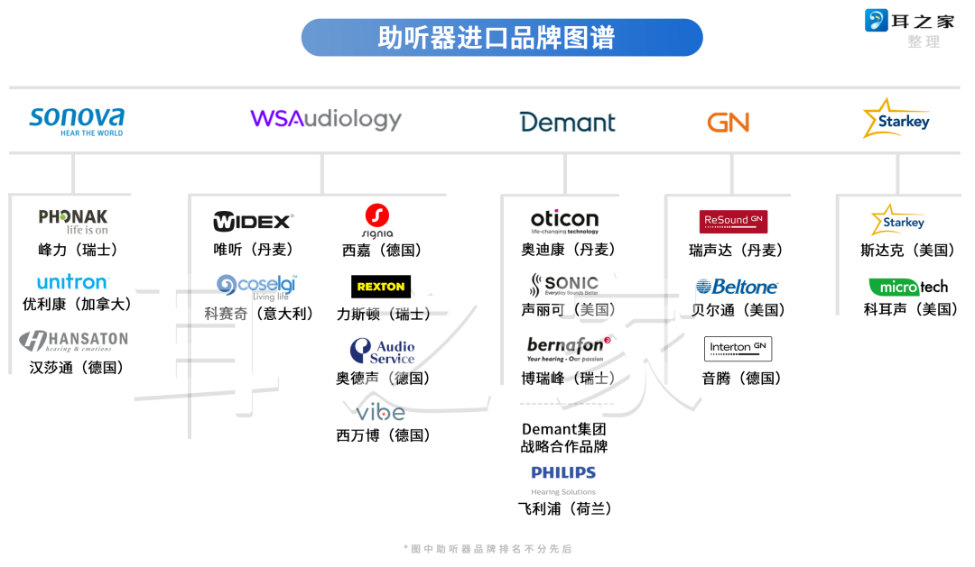 這五大聽力巨頭分別是:Sonova索諾瓦(峰力、優(yōu)利康、漢莎通),WSA(西嘉、唯聽、力斯頓),戴蒙特Demant(奧迪康、聲麗可、博瑞峰),GN Resound(瑞聲達、貝爾通),Starkey(斯達克、科耳聲)。