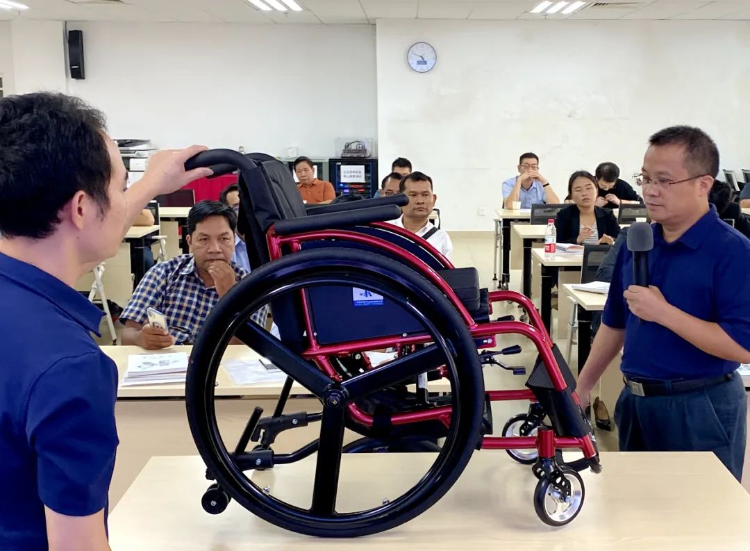 2023年9月19日至23日,瀾湄輔助器具項(xiàng)目培訓(xùn)班在我國廣州舉辦。圖為中國殘疾人輔助器具中心老師為學(xué)員講解輔具知識。