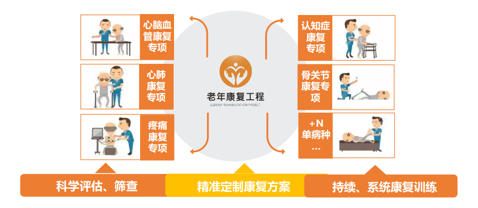 老年康復(fù)工程的主要康復(fù)專項(xiàng),是依托優(yōu)質(zhì)康復(fù)資源,以模塊化的單病種康復(fù)服務(wù)體系,賦能給養(yǎng)老服務(wù)機(jī)構(gòu)——給規(guī)劃、給運(yùn)營體系、給培訓(xùn)輔導(dǎo)、給增值產(chǎn)品。