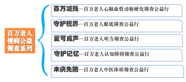 老年康復(fù)工程已推出了多個(gè)“百萬老人慢病公益篩查”系列活動(dòng),項(xiàng)目主要圍繞老年人常見慢病,用優(yōu)質(zhì)資源和品牌項(xiàng)目,開展公益活動(dòng);通過公益活動(dòng),進(jìn)行市場推廣和培育,轉(zhuǎn)化自費(fèi)用戶;發(fā)揮基金會(huì)的公募優(yōu)勢,以公益活動(dòng)帶動(dòng)社會(huì)資金籌措,反哺于自身業(yè)務(wù)。