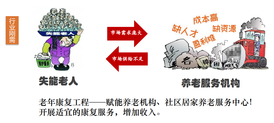 當(dāng)前養(yǎng)老行業(yè)面臨著成本高漲、人才短缺、盈利困難、資源匱乏等諸多問題,導(dǎo)致市場供給不足。養(yǎng)老服務(wù)機(jī)構(gòu)、社區(qū)養(yǎng)老服務(wù)中心在失能老人的護(hù)理方面面臨諸多挑戰(zhàn)。為了解決這一系列問題,老年康復(fù)工程應(yīng)運(yùn)而生。該工程旨在賦能養(yǎng)老機(jī)構(gòu)和社區(qū)居家養(yǎng)老服務(wù)中心,開展適宜的康復(fù)服務(wù)以增加收入。