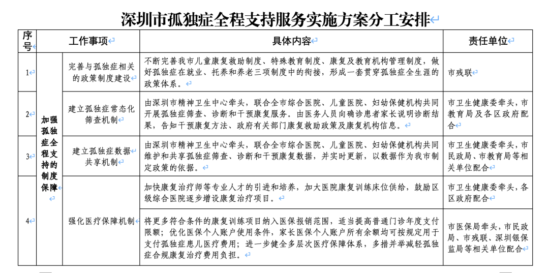 “持續(xù)提升孤獨(dú)癥早期篩查、診斷、康復(fù)水平,推進(jìn)孤獨(dú)癥兒童融合教育,促進(jìn)成年孤獨(dú)癥就業(yè),加強(qiáng)重癥孤獨(dú)癥托養(yǎng),做好孤獨(dú)癥民生兜底保障和無障礙環(huán)境建設(shè),建立完善我市孤獨(dú)癥全程支持服務(wù)體系。”