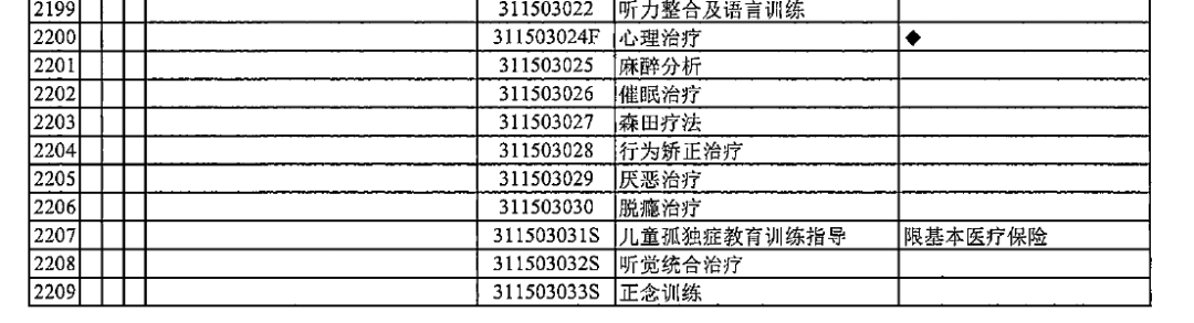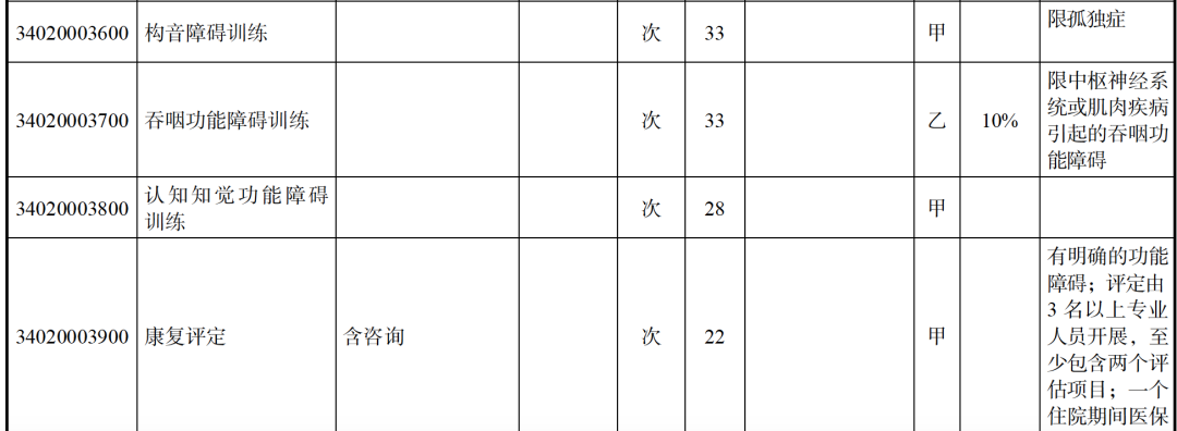 這29個(gè)項(xiàng)目,都規(guī)定了對(duì)應(yīng)的支付范圍。其中,明確與自閉癥相關(guān)的項(xiàng)目是ADI測(cè)評(píng),言語訓(xùn)練、認(rèn)知訓(xùn)練和作業(yè)療法等在部分地區(qū)也是自閉癥醫(yī)療康復(fù)服務(wù)的內(nèi)容。