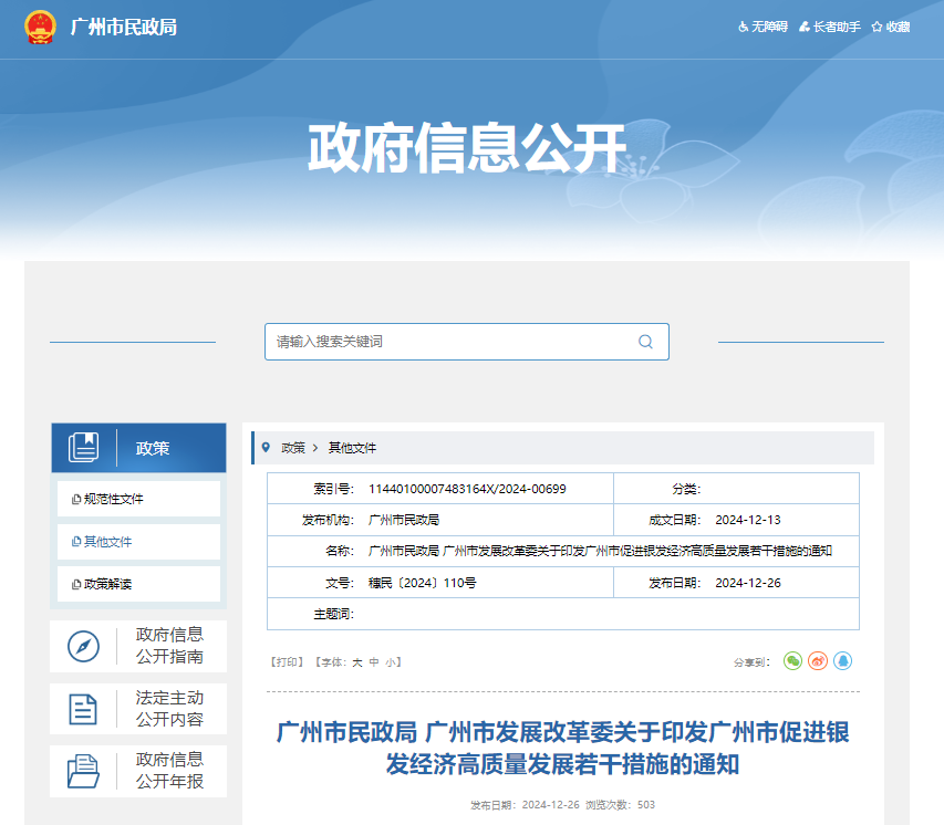 近日,經(jīng)廣州市人民政府同意,《廣州市民政局 廣州市發(fā)展改革委關(guān)于印發(fā)廣州市促進(jìn)銀發(fā)經(jīng)濟(jì)高質(zhì)量發(fā)展若干措施的通知》(穗民〔2024〕110號,下稱《措施》)正式出臺。《措施》對標(biāo)對表《國務(wù)院辦公廳關(guān)于發(fā)展銀發(fā)經(jīng)濟(jì)增進(jìn)老年人福祉的意見》26項舉措和7大潛力產(chǎn)業(yè),結(jié)合我市重點產(chǎn)業(yè)審視、業(yè)務(wù)圖譜初步成果和老年人需求深化調(diào)研成果,聚焦老年人高頻需求和我市優(yōu)勢產(chǎn)業(yè),從民生事業(yè)、重點賽道和支撐保障三個方面提出10條操作性強(qiáng)的措施。