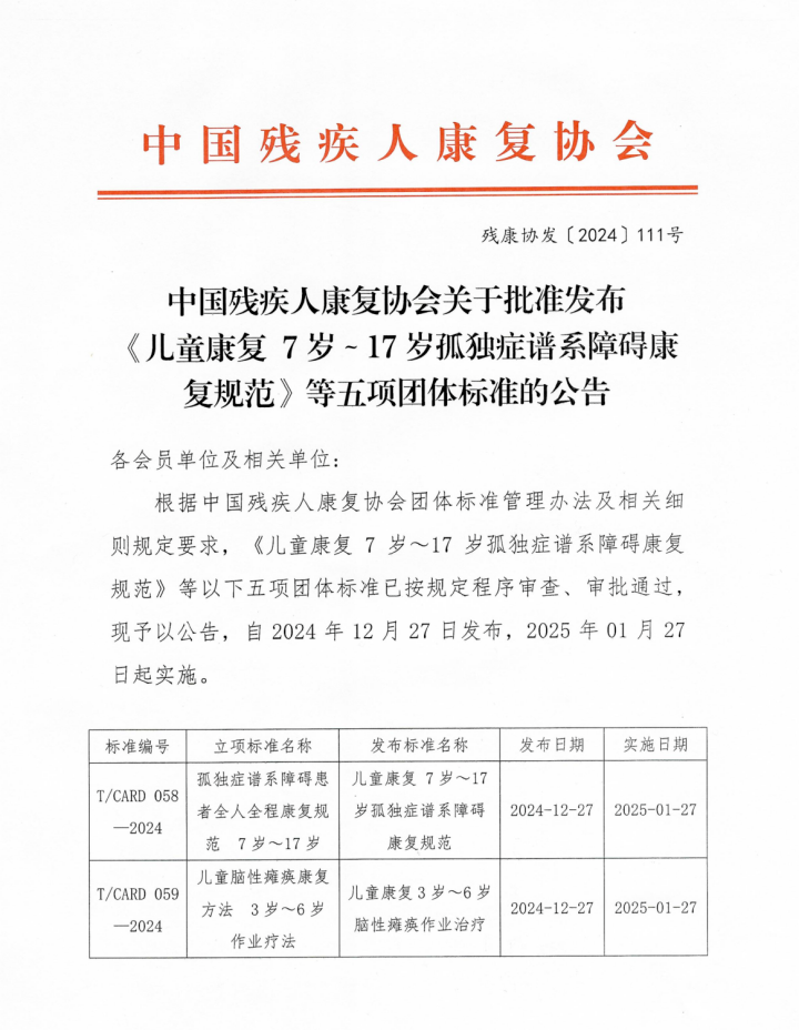近日,中國殘疾人康復(fù)協(xié)會發(fā)布關(guān)于批準(zhǔn)發(fā)布《兒童康復(fù)7歲~17歲孤獨癥譜系障礙康復(fù)規(guī)范》等五項團(tuán)體標(biāo)準(zhǔn)的公告。公告稱《兒童康復(fù)7歲~17歲孤獨癥譜系障礙康復(fù)規(guī)范》等五項團(tuán)體標(biāo)準(zhǔn)已按規(guī)定程序?qū)彶?、審批通過,自2024年12月27日發(fā)布,2025年1月27日起實施。