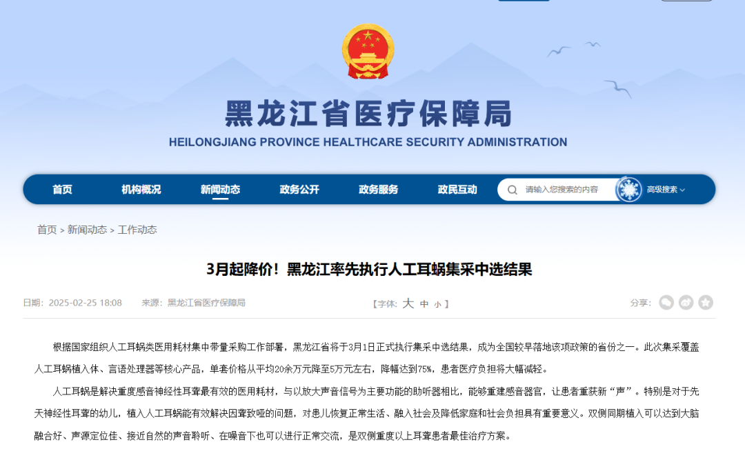 根據(jù)國家組織人工耳蝸類醫(yī)用耗材集中帶量采購工作部署,黑龍江省于3月1日正式執(zhí)行集采中選結(jié)果,成為全國較早落地該項政策的省份之一。此次集采覆蓋人工耳蝸植入體、言語處理器等核心產(chǎn)品,單套價格從平均20余萬元降至5萬元左右,降幅達到75%,患者醫(yī)療負擔將大幅減輕。