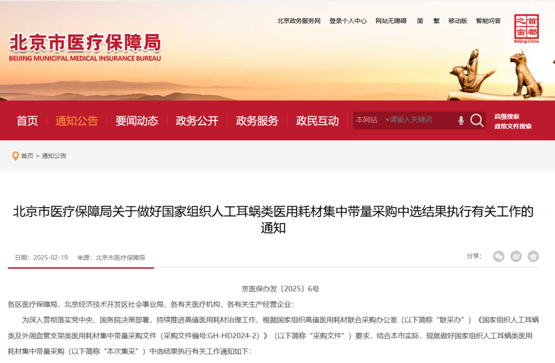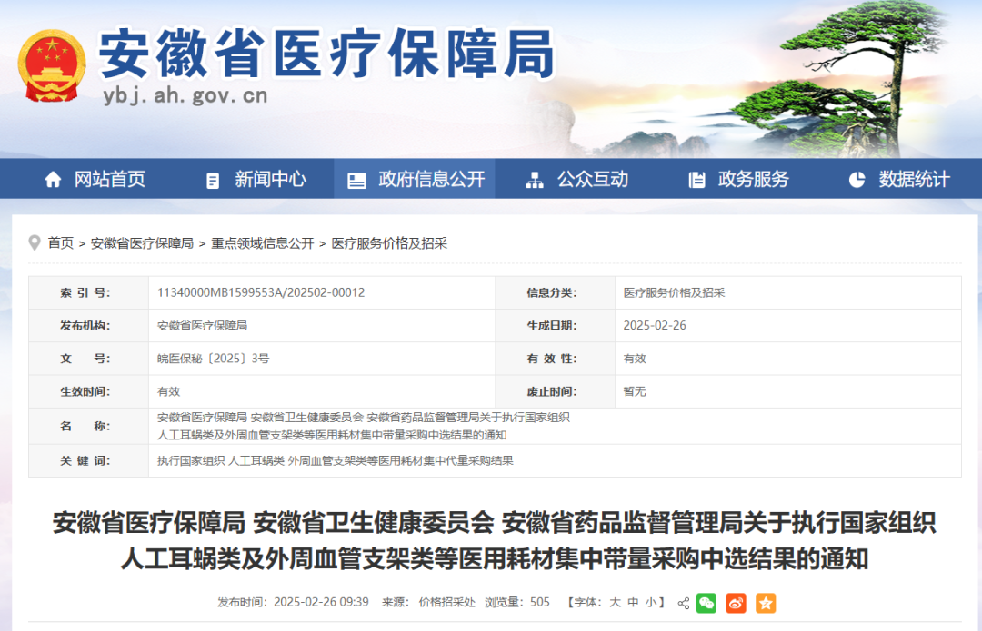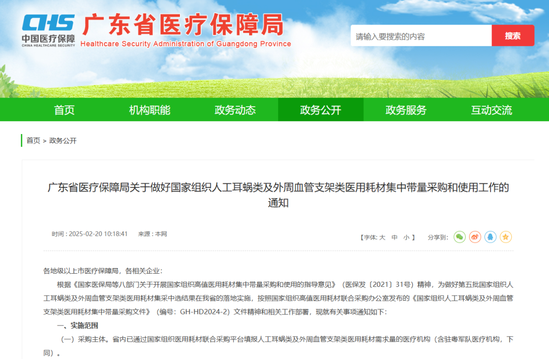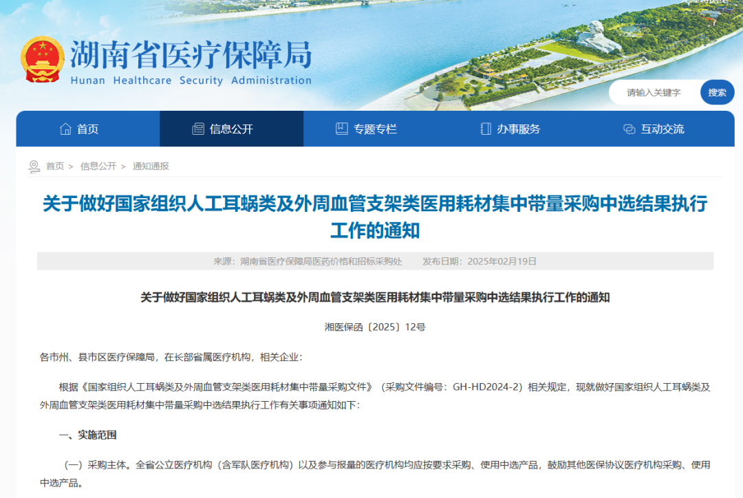 3月3日,陜西省醫(yī)療保障局發(fā)布《關(guān)于做好人工耳蝸等醫(yī)用耗材集中帶量采購和使用工作的通知》,其中指出,自2025年3月31日起執(zhí)行人工耳蝸、乳房旋切針、血管組織閉合用結(jié)扎夾、導引導管和導引導絲、預充式導管沖洗器等醫(yī)用耗材集中帶量采購中選結(jié)果;自2025年5月1日起執(zhí)行外周血管支架集采中選結(jié)果。其中人工耳蝸、外周血管支架、乳房旋切針采購周期3年,血管組織閉合用結(jié)扎來、導引導管和導引導絲接續(xù)采購周期2年,預充式導管沖洗器采購周期1年。