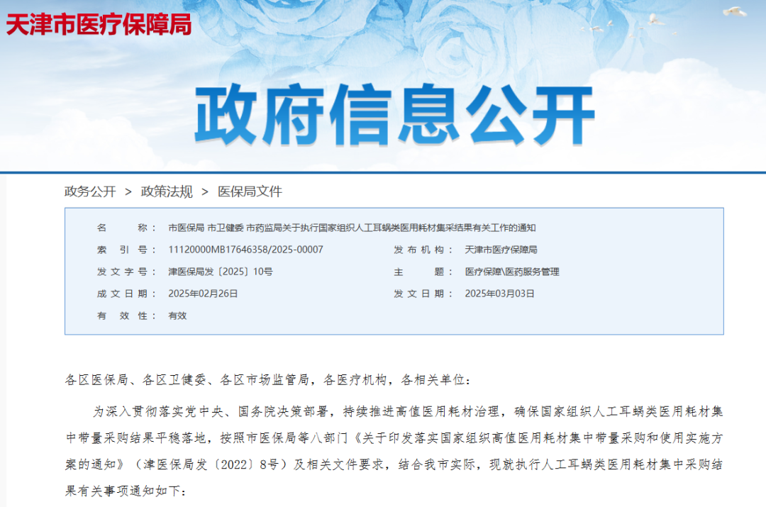 3月3日,天津市醫(yī)保局聯(lián)合有關(guān)部門發(fā)布了《關(guān)于執(zhí)行國家組織人工耳蝸類醫(yī)用耗材集采結(jié)果有關(guān)工作的通知》,自3月1日起,天津市相關(guān)患者可以使用上集采降價后的人工耳蝸中選產(chǎn)品,標志著國家集采人工耳蝸中選結(jié)果在津正式落地。