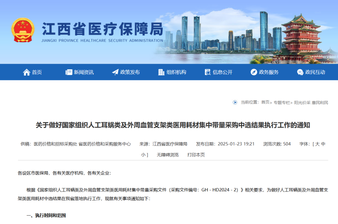 1月23日,江西省醫(yī)保局發(fā)布《關(guān)于做好國家組織人工耳蝸類及外周血管支架類醫(yī)用耗材集中帶量采購中選結(jié)果執(zhí)行工作的通知》,人工耳蝸高值醫(yī)用耗材國家集采中選結(jié)果本月起已在江西省內(nèi)全面執(zhí)行。