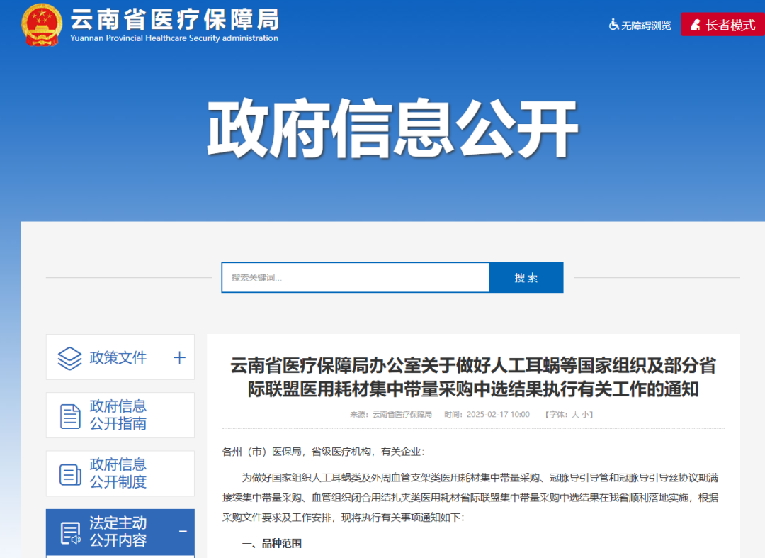 2月7日,云南省醫(yī)療保障局正式發(fā)布《云南省醫(yī)療保障局辦公室關(guān)于做好人工耳蝸等國家組織及部分省際聯(lián)盟醫(yī)用耗材集中帶量采購中選結(jié)果執(zhí)行有關(guān)工作的通知》,規(guī)定國家組織人工耳蝸類醫(yī)用耗材集中帶量采購、冠脈導引導管和冠脈導引導絲協(xié)議期滿接續(xù)集中帶量采購、血管組織閉合用結(jié)扎夾類醫(yī)用耗材省際聯(lián)盟集中帶量采購中選結(jié)果自2025年3月1日起執(zhí)行。