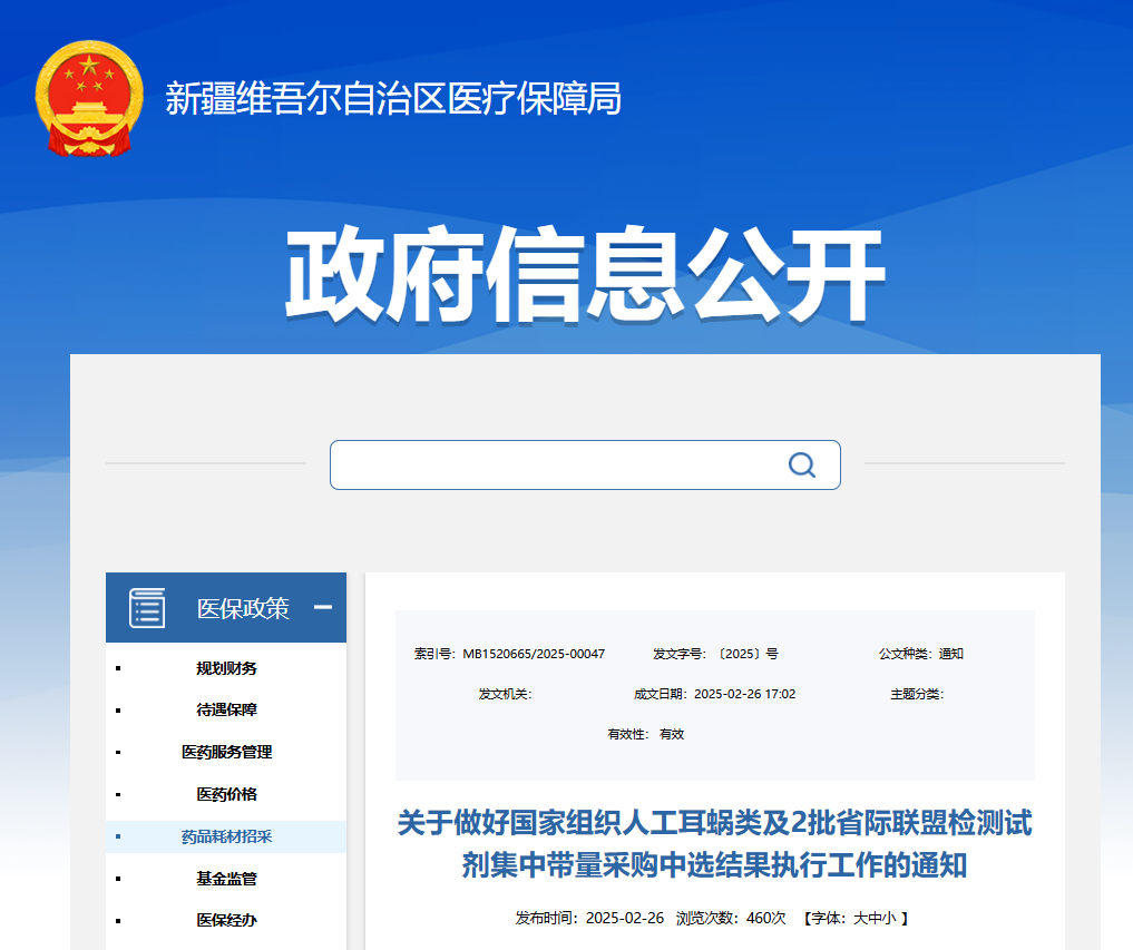 3月3日,新疆維吾爾自治區(qū)醫(yī)療保障局發(fā)布通知,明確自2025年3月1日起正式執(zhí)行人工耳蝸集中帶量采購中選結(jié)果,并于3月15日同步落地安徽2023年體外診斷試劑、江西腎功和心肌酶生化類檢驗試劑集采成果。