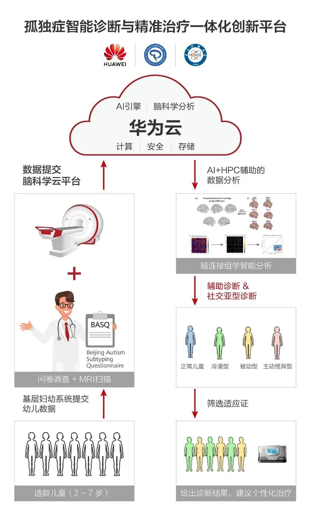 北京大學(xué)神經(jīng)科學(xué)研究所攜手華為云EI創(chuàng)新孵化Lab腦科學(xué)團(tuán)隊(duì),在腦疾病臨床和腦科學(xué)研究方面的社會(huì)性示范應(yīng)用方面開展了一系列創(chuàng)新性的合作嘗試。聯(lián)合研發(fā)團(tuán)隊(duì)正通過前沿AI腦科學(xué)研究手段,啟動(dòng)一系列基于孤獨(dú)癥患兒腦影像多模態(tài)數(shù)據(jù)進(jìn)行生物標(biāo)記物異常識(shí)別的早篩和亞型診斷算法研發(fā)和基于AI視覺的孤獨(dú)癥兒童突出能力識(shí)別算法研發(fā),并將通過把研發(fā)成果集成上線到華為云AI腦科學(xué)平臺(tái)面向全國各基層單位進(jìn)行推廣應(yīng)用,從而完成“AI腦疾病算法研發(fā)->臨床成果轉(zhuǎn)化應(yīng)用->臨床研究數(shù)據(jù)匯聚->進(jìn)一步提升AI算法準(zhǔn)確性和適用性”的平臺(tái)運(yùn)行生態(tài)閉環(huán)。