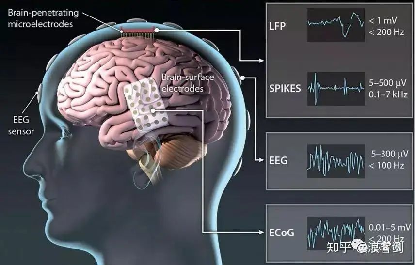根據(jù)信號(hào)采集方式和技術(shù)的不同,腦機(jī)接口可分為非侵入式(腦外)、侵入式和半侵入式。非侵入式是指無需通過侵入大腦,只需要通過附著在頭皮上的穿戴設(shè)備來對(duì)大腦信息進(jìn)行解讀,常見技術(shù)為腦電圖(EEG);半侵入式則是將腦機(jī)接口植入到顱腔內(nèi),但是植入位置在大腦皮層之外,主要基于皮層腦電圖(ECoG)進(jìn)行信息分析;而侵入式則是通過手術(shù)等方式直接將電極植入到大腦皮層,微電極陣列(MEA)和神經(jīng)元放電檢測(cè)(SUA)則最為常見,以此獲得高質(zhì)量的大腦神經(jīng)信號(hào)。