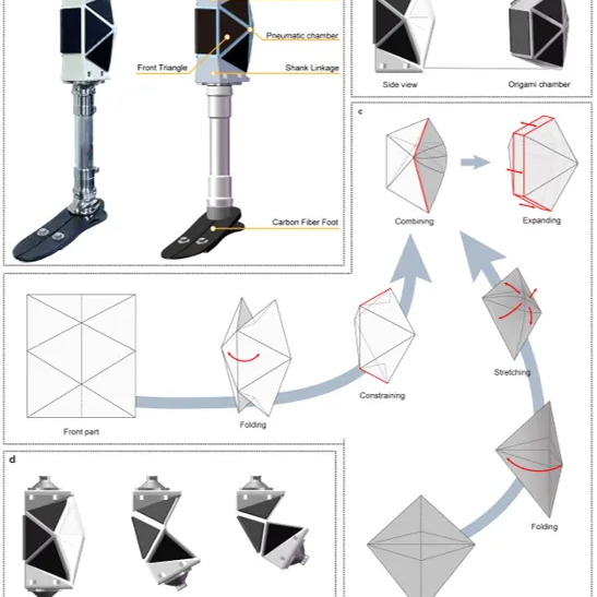 北京大學工學院先進制造與機器人系王啟寧教授課題組則研發(fā)出了全球首款基于折紙結構的仿生軟體膝關節(jié)假肢。該款假肢受到馬尾草啟發(fā),主體由熱塑性聚氨酯3D打印制成,膝關節(jié)單元重量僅300g,假肢高度僅15cm,折紙結構的大范圍折展特性,可滿足膝關節(jié)大范圍運動的要求。