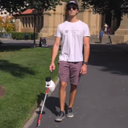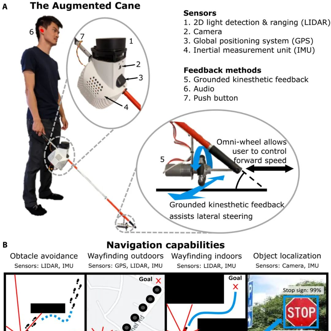 除此之外,斯坦福大學(xué)智能系統(tǒng)實(shí)驗(yàn)室也研發(fā)出了一款智能導(dǎo)盲手杖。該手杖搭載了激光雷達(dá)、GPS,可根據(jù)目的地進(jìn)行實(shí)時(shí)導(dǎo)航,也可為視障人群進(jìn)行障礙探測(cè)并規(guī)劃路線。