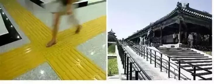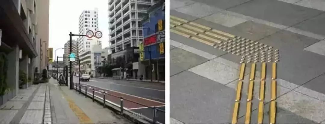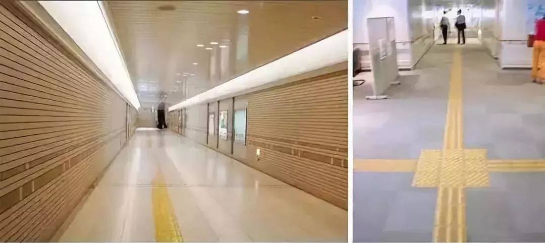 左:條狀凸起盲道,指示盲人沿著條線向前走