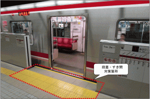 縫隙的應(yīng)對措施:在站臺前端設(shè)置梳狀縫隙填充材料(橡膠制),以保證在電車與站臺不接觸的情況下將縫隙縮短至最小限度(20~30毫米)。