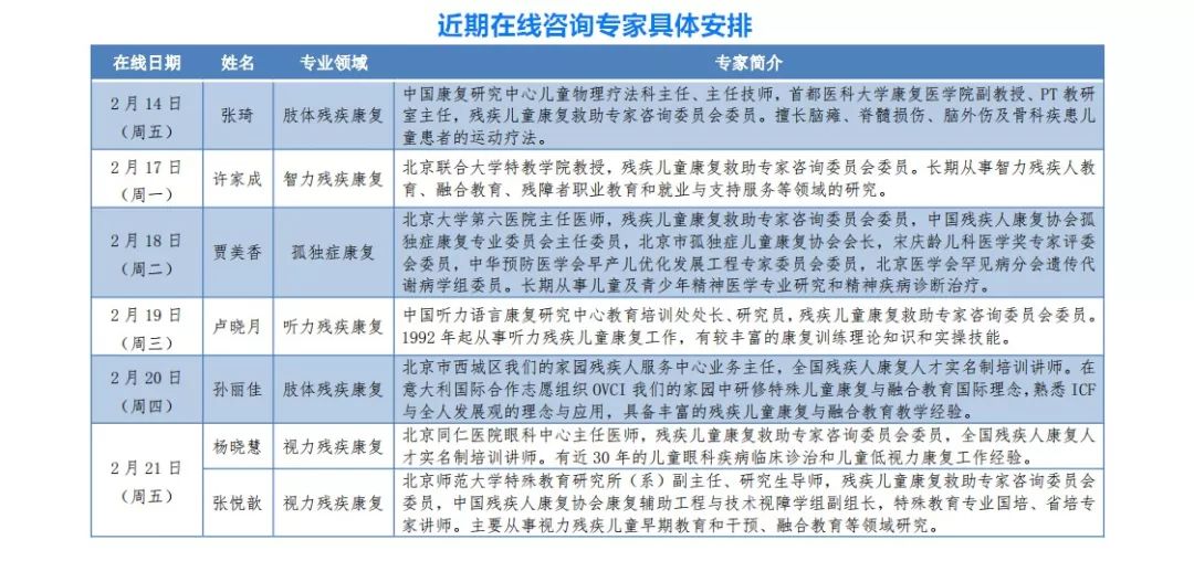 為切實(shí)做好疫情防控工作,幫助廣大殘疾兒童居家開展康復(fù)訓(xùn)練,中國(guó)殘聯(lián)將于2月14日開設(shè)“抗擊疫情 殘疾兒童康復(fù)專家在線咨詢”專欄,邀請(qǐng)康復(fù)領(lǐng)域具有豐富實(shí)踐經(jīng)驗(yàn)的專家在線為殘疾兒童家長(zhǎng)提供專業(yè)解答。