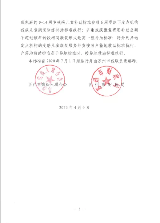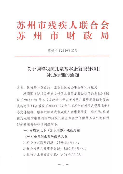 日前,蘇州市殘疾人聯(lián)合會、蘇州市財政局聯(lián)合下發(fā)《關于調整殘疾兒童基本康復服務項目補助標準的通知》。根據(jù)該通知,從2020年7月1日起,蘇州市對在定點機構康復訓練的殘疾兒童基本醫(yī)療保險結算以外的自付部分費用補助標準進行調整,殘疾兒童基本康復項目補助標準再提高,補助年齡也進一步擴大至18歲。